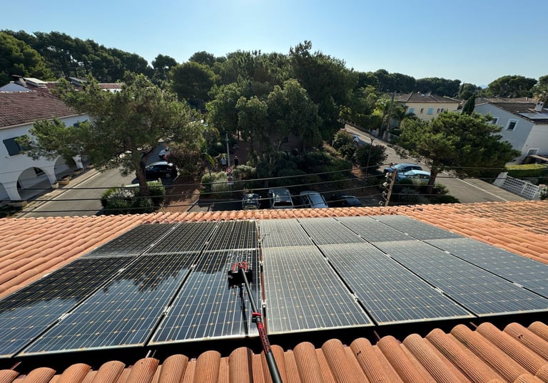 Chez PannÔpropre, chaque détail compte. Nous utilisons uniquement du matériel professionnel spécialement conçu pour le nettoyage des panneaux solaires. Brosses douces, perches télescopiques et systèmes à eau osmosée nous permettent de garantir un résultat impeccable, sans jamais abîmer vos installations.